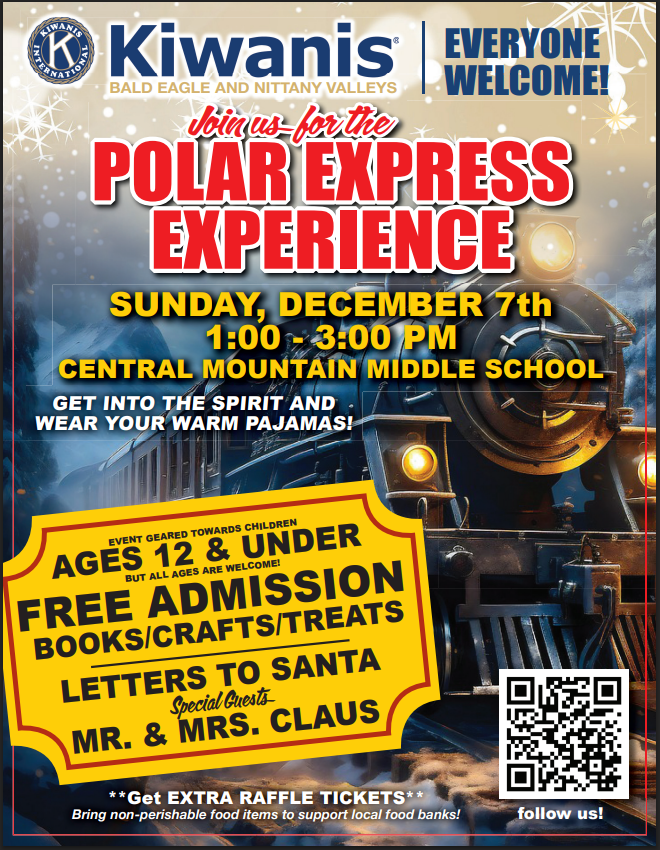 Kiwanis of BENV is proud to announce the 2025 Santa’s Workshop! This year’s theme is… the Polar Express Experience! Santa’s Workshop will take place on Sunday, December 7th from 1:00 to 3:00pm at the Central Mountain Middle School. Feel free to get cozy and get into the spirit by wearing your PJ’s this year! Admission is free, but bring non-perishable food items to receive extra raffle tickets to support our local food banks! We look forward to having you come aboard this year’s Santa’s Workshop as we take a journey on the Polar Express!!!